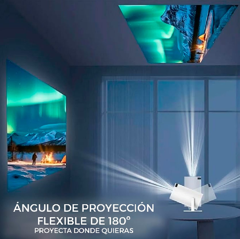 Disfruta de una calidad de imagen sorprendente con soporte 4K y resolución nativa de 720p Full HD. Su diseño giratorio de 180° te permite proyectar en cualquier dirección, incluso en el techo, haciendo que cada sesión de cine sea cómoda y especial. Además, su corrección trapezoidal automática asegura una imagen perfectamente ajustada en todo momento.